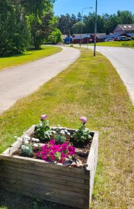Längs infarten finns det 5 blomlådor som vi nu vill ha hjälp att fylla med blommor och sköta om. Vi vill prova ett nytt sätt att sköta dem på.
